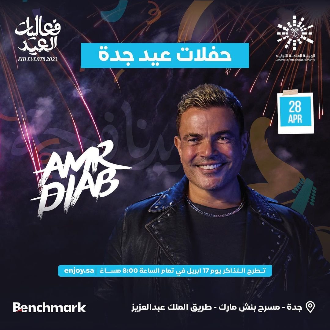 سيُقام حفل عمرو دياب خلال عيد الفطر 2023 في جدة، وذلك يوم الجمعة 28 أبريل 2023. سيُقام الحفل تحديداً على مسرح بنش مارك في طريق الملك عبدالعزيز في جدة. سيتمّ طرح التذاكر في 17 أبريل 2023 عند الساعة 8 مساءً.