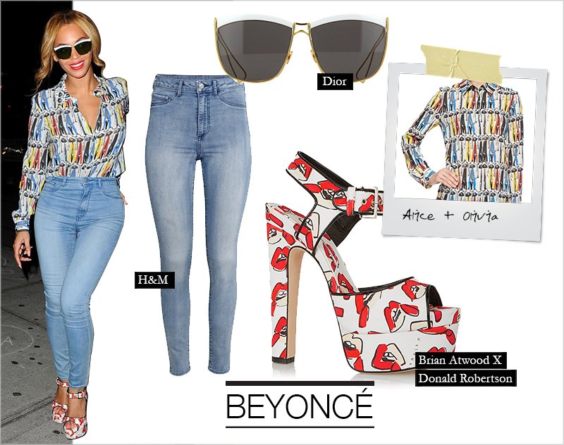 في قميص من Alice Olivia، سروال من H&M، نظّارات شمسيّة من Dior وحذاء من Brian Atwood X Donald Robertson