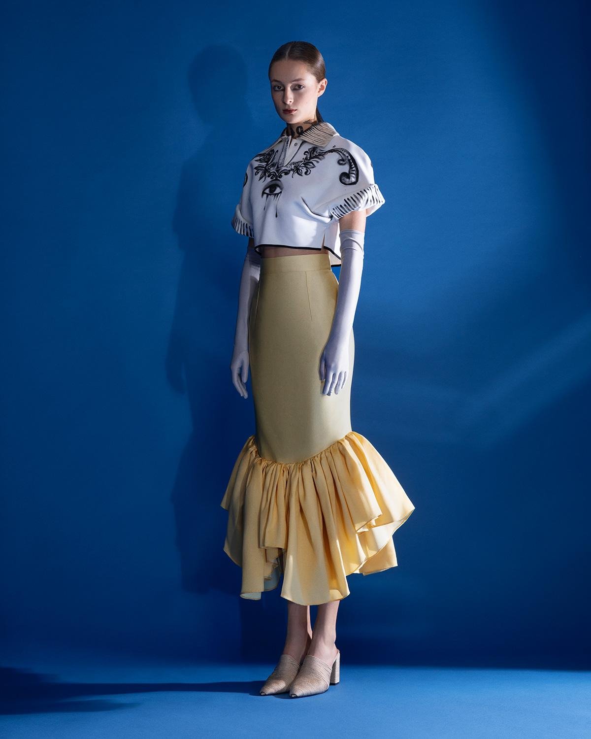 كذلك، ألوان الباستيل هيمنت على هذه المجموعة، بدءً من الأصفر الهادئ، الزهري والأخضر النعناعي. كما أن الألوان القويّة تداخلت إلى المجموعة، مثل البنّي، الأسود، الكحلي والبرتقالي، ليكون هذا الأمر بمثابة تعبير عن المشاعر المتناقضة التي تهيمن على اللبنانيين. هذا واتّسمت بعض القطع بطبعات رُسمت على أيدي المصمّم حسين بظاظا، جسّدت بشكلٍ لافت مشاعره الخاصّة. بالإضافة إلى ذلك، ركّزت أيضاً الدار في هذه المجموعة على اللوكات موحّدة اللون، والتي تتميّز بالأشكال الهندسية، الطيّات الملفتة والقصّات الكبيرة، بعيداً عن الزخرفات المنمّقة. هذا الأمر ساهم في تسليط الضوء أكثر فأكثر على القطعة بحدّ ذاتها.