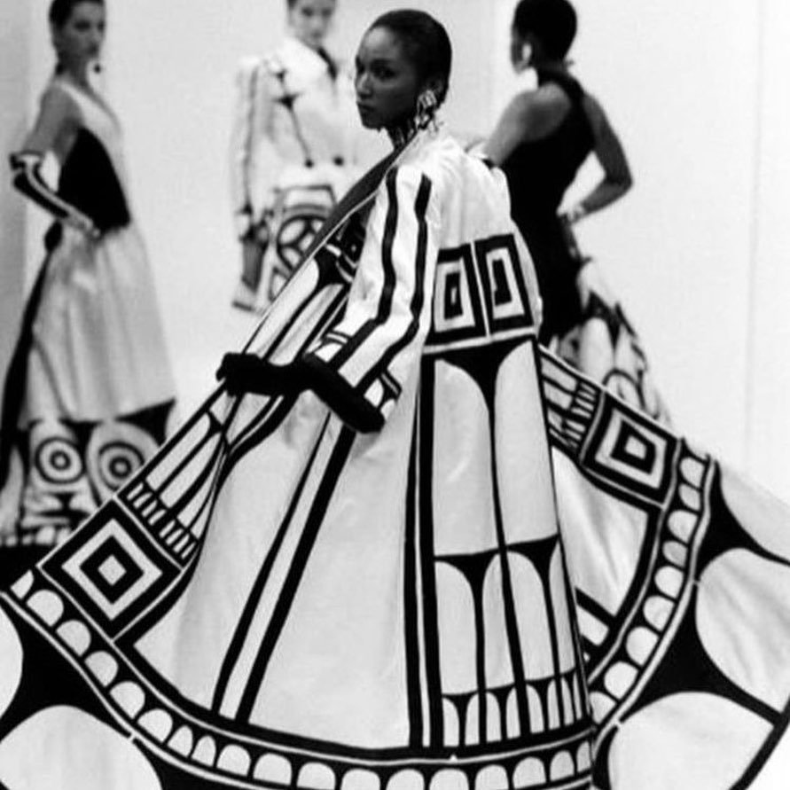لإطلالتها الأولى، اختارت الشيخة موزا تصميماً من مجموعة Valentino للخياطة الراقية لخريف 1989، عبارة عن معطف أنيق وفخم مقترن بأشكال هندسية مميزة، وهو مستوحى من المهندس المعماري الفييني Josef Hoffman. التصميم الاصلي يأتي باللونين الاسود والابيض أما المعطف الذي صُمّم خصيصاً لها فهو بالتدرجين الاسود والزهري. اعتمدت الشيخة موزا تحت المعطف فستان باللون الاسود وأرفقت الاطلالة بتربان صُمّم خصيصاً من قِبل Stephen Jones. اكتمل لوكها الفاخر بأقراط ماسية من Lorraine Schwartz، كانت قد اعتمدتها في وقتٍ سابق، كما حملت حقيبة يد صغيرة باللّون الأسود. من الناحية الجمالية، لجأت إلى مكياج سموكي.