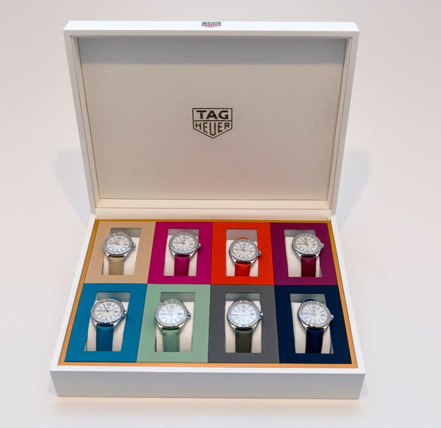 - تاغ هوير أكواريسر ليدي كاليبر 9 بآلية الحركة الأوتوماتيكية: تأتي نسخة هذا العام مزودةً بآلية حركة أوتوماتيكية كاليبر 9، وتتمتع هذه الساعة الرياضية بمزايا مقاومة للماء حتى عمق 300 متر، كما أنها تعرض علامات متوهجة تعكس تميّز مجموعة تاغ هوير أكواريسر. تحتوي الساعة على إطار يدور باتجاه واحد لقياس حدود الوقت يتمتّع بـ6 حلقات مصقولة وعقارب ومؤشرات للساعات والدقائق مطلية بمادة سوبر- لومينوفاTM، ما يعزّز من الرؤية والوضوح عند الغوص في المياه العميقة. من بين ميزات هذا الإصدار، يبرز الميناء المحزز ونافذة التاريخ بصورة شديدة الوضوح، وتصميم السهم في عقرب الثواني، فضلاً عن باقة من الخصائص التقنية التي تميّز مجموعة تاغ هوير أكواريسر بآلية الحركة الأوتوماتيكية. يمتاز ميناء هذه الساعة الفولاذي المشغول من مادة عرق اللؤلؤ باللونين الأسود والأبيض بقطر 32 مم، كما تتوافر هذه النسحة بميناء مرصع بـ 11 قطعة ألماسية بقطر 1.40 مم (عيار 0.11 قيراط). تبدأ الأسعار من: 7600 درهم إماراتيٍ